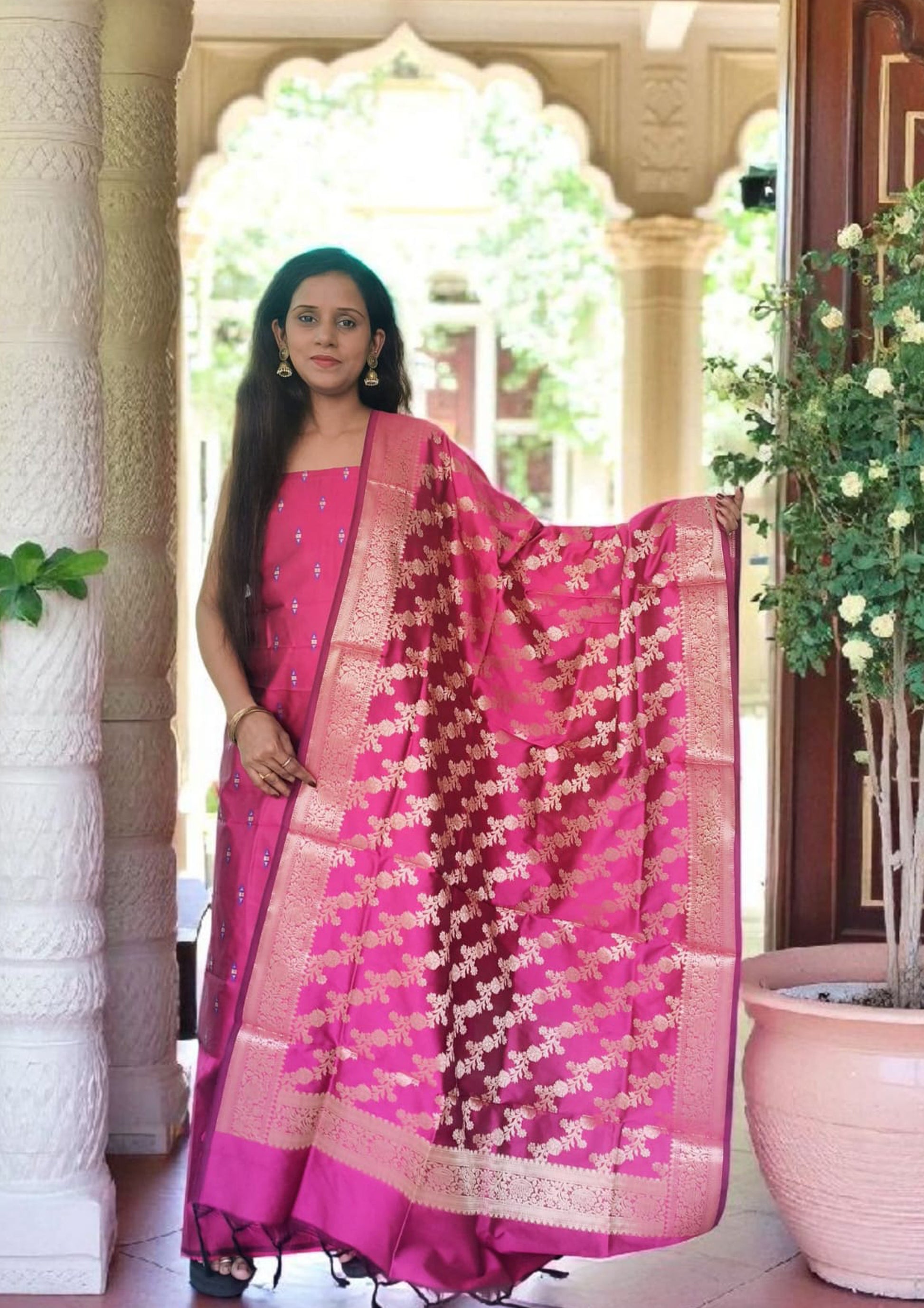 Inspired by timeless Banarasi artistry, our mix Banarasi suits offer the elegance of silk with the ease of blended fabrics. A perfect balance of tradition and everyday wearability.